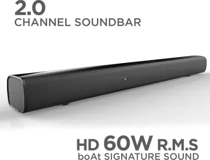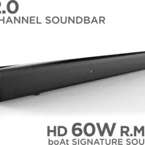 Discover a new level of immersive, cinematic audio experience at home with the boAt AAVANTE Bar 1150 Soundbar. A powerful 60 W total output that amplifies every aspect of your entertainment. The 2.0 channel sound system provides a balanced sound and deep bass for your movies, music and even video games and you can experience the cinematic sound that revolves around you. Stay plugged into the sound with an array of wired connections, and Bluetooth® wireless technology. Bring your home to life with the boAt AAVANTE Bar 1150.