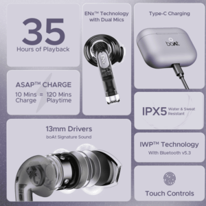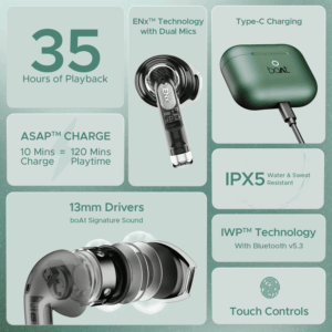 Introducing Airdopes Alpha with powerful 13mm drivers that immerse you in your jam with boAt Signature Sound. Enjoy the convenience of 35 Hours of battery life and ASAP™ Charge and keep grooving to your tunes. Experience crystal-clear calls with ENx™ Technology and seamless device connection with IWP™ Technology, and power through your hustle like an alpha. Unleash the Alpha and elevate your audio experience with true wireless freedom!
