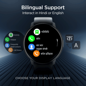 Connect on the go with your people via Lunar Connect. Powered by AI noise cancellation Lunar Connect’s ENx™ Algorithm allows you to be heard clearly during calls, cancelling out the background noise. This 1.28” (3.25 cm) HD round dial smartwatch comes with Single-chip BT calling for an ultra-seamless calling experience. Choose between Hindi or English as your preferred language as Lunar Connect is bilingual!