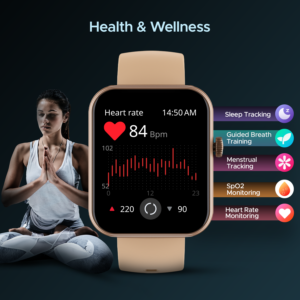 Track, Monitor and record your health and wellness journey. Featuring SpO2 monitoring, menstrual tracking, and sleep monitoring, it tracks your vitals 24X7. Keep them in check with meditative breathing with Guided breath feature on our Calling smart watch.