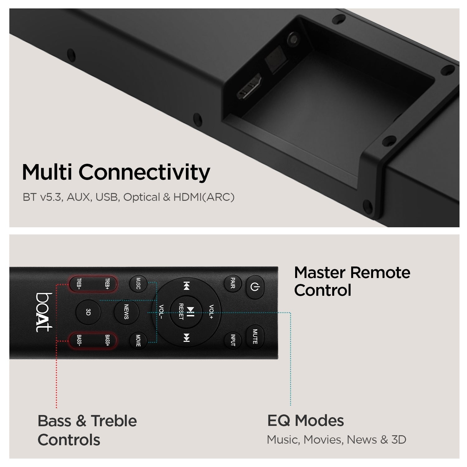 Stream all your music wirelessly or via wire as Aavante Bar 1550 Pro is compatible with USB, AUX, BT, Optical, Coaxial, and HDMI (arc). Not just this, choose from its multiple EQ Modes— Music, Movies, NEWS & 3D from the master remote & set the sound according to your entertainment.