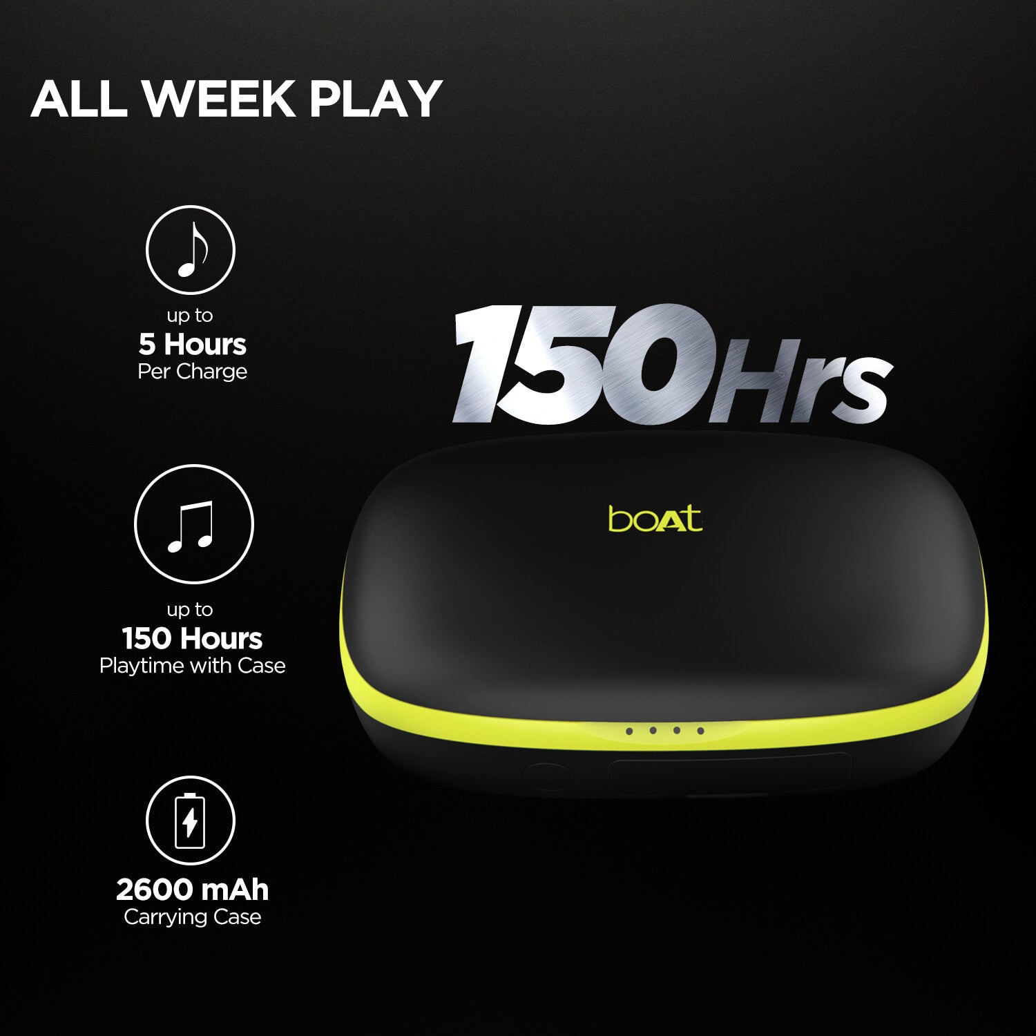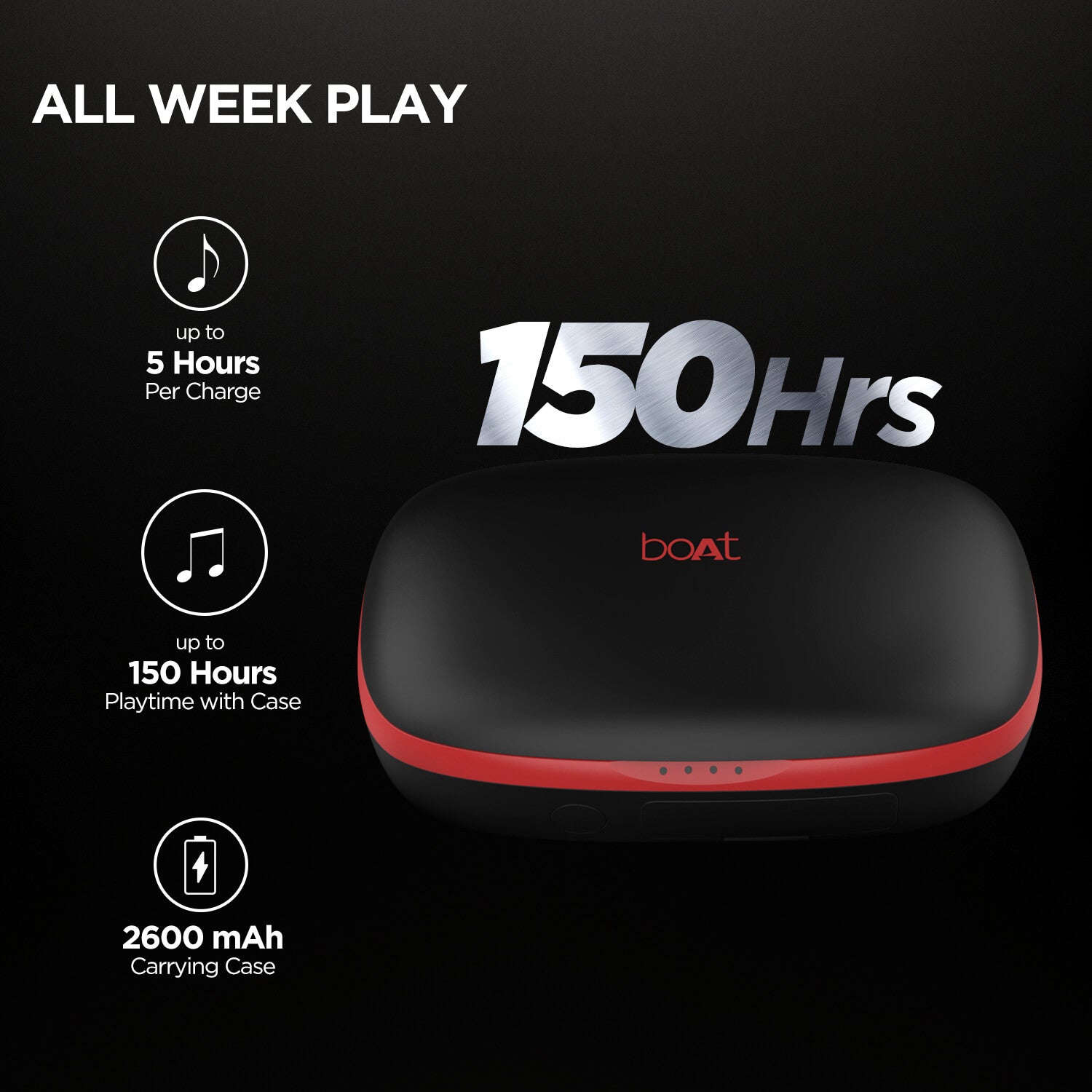 Experience everlasting playback with 5 Hours of sound per charge and 150 Hours of playback time with the magic of carry cum charge cases.
