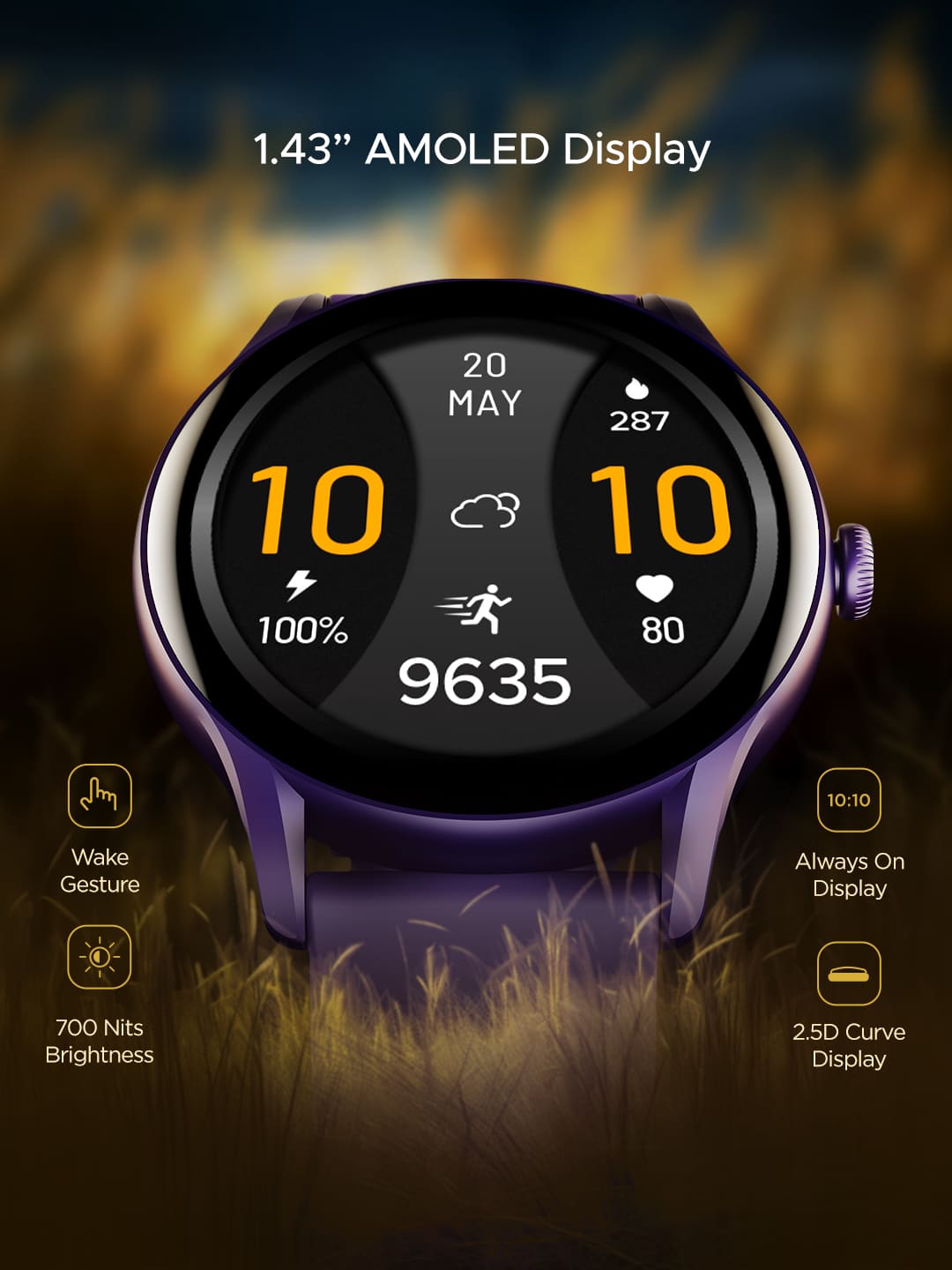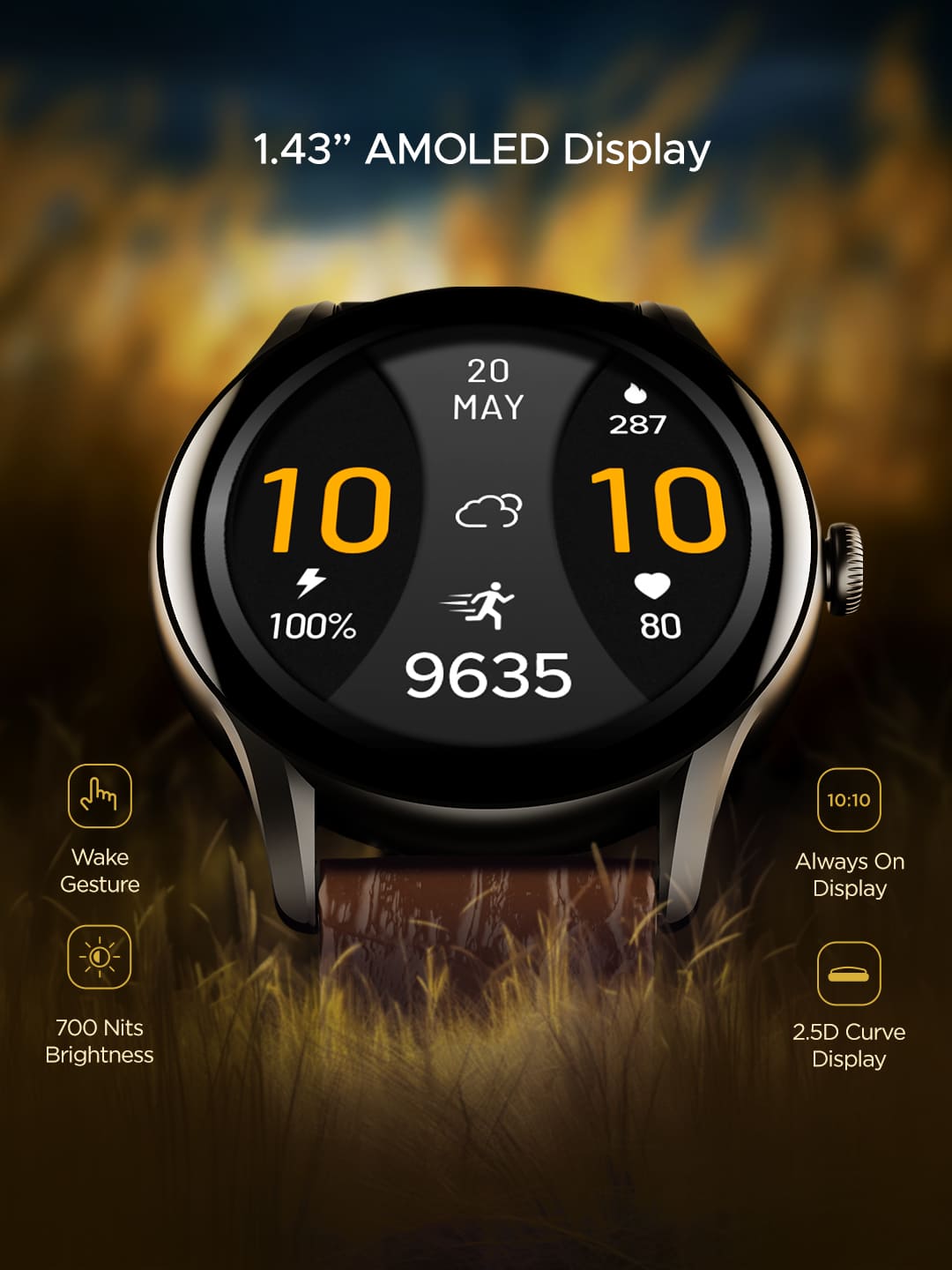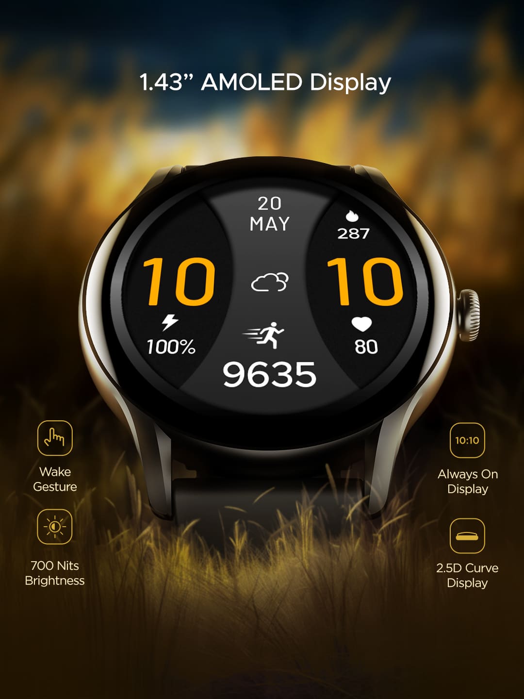 Experience excellence with 1.43” AMOLED Display that gets you unmatched clarity and rich colour output. Choose to keep it on Always On Display never miss any detail with its 700 Nits brightness.