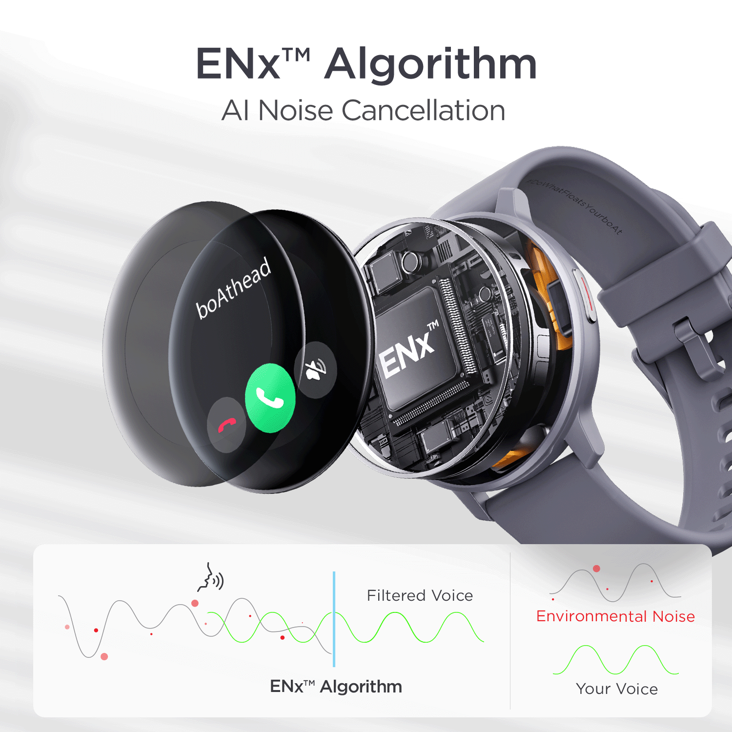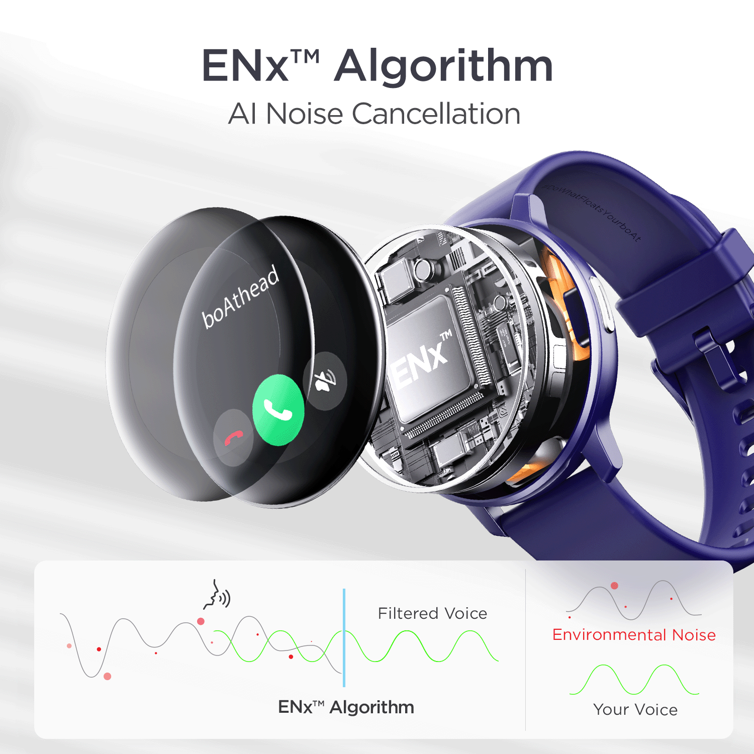 boAt Signature Audio ENx™ Technology is now in boAt Smartwatches. This enables you to have clear calls right from your wrist. The ENx™ Algorithm learns the difference between the human voice and any background sound and then uses that information to suppress the noise in background.