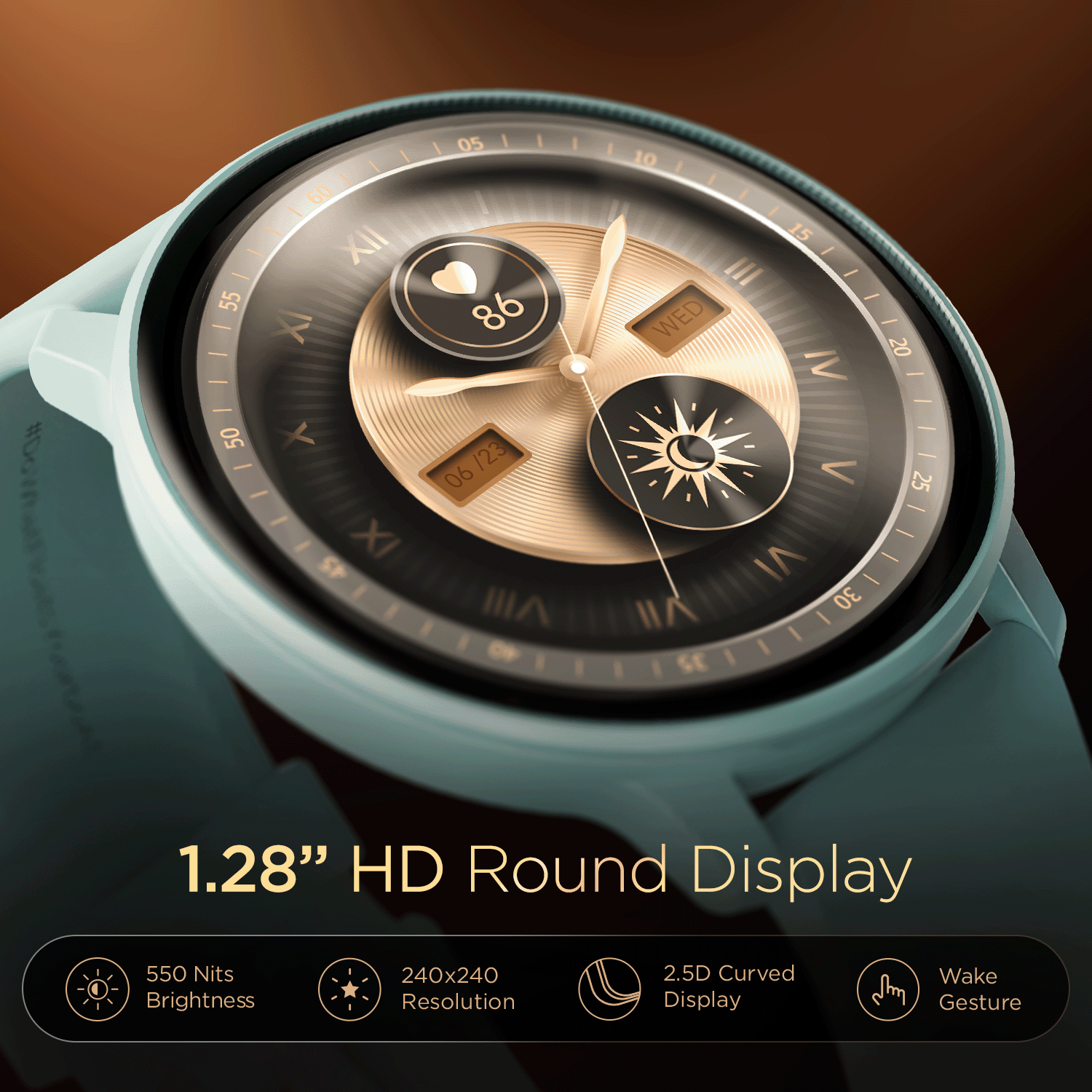 Experience an all-new 1.28” (3.25 cm) HD round aesthetic display with 550 Nits brightness and a 2.5D curve. With a flick of your wrist turn your display on with the wake gesture.