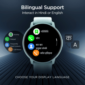 Connect on the go with your people via Lunar Connect. Powered by AI noise cancellation Lunar Connect’s ENx™ Algorithm allows you to be heard clearly during calls, cancelling out the background noise. This 1.28” (3.25 cm) HD round dial smartwatch comes with Single-chip BT calling for an ultra-seamless calling experience. Choose between Hindi or English as your preferred language as Lunar Connect is bilingual!