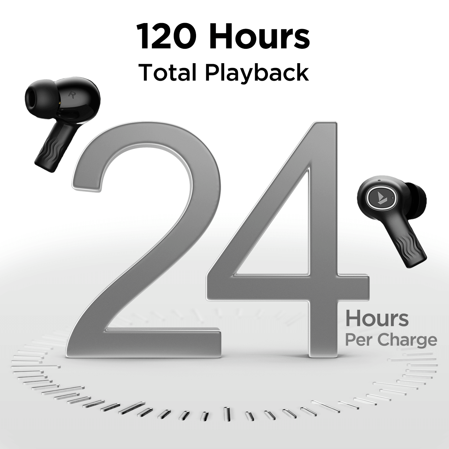 24 Hours earbuds playback & 120 Hours total playback.