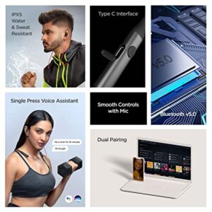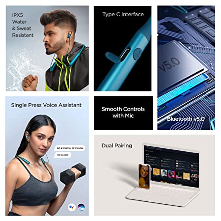 The earbuds are magnetic and are IPX5 rated to offer resistance against water and sweat. Charging this Headset is easy as there is a Type C interface for the same. It offers wireless connectivity via Bluetooth v5.0 and lets the user connect it to two devices simultaneously via dual pairing. . You can command your playback, hands-free and smart voice assistant via its easy to access integrated controls and built-in mic. The wireless earphones come in 3 stylish variants.