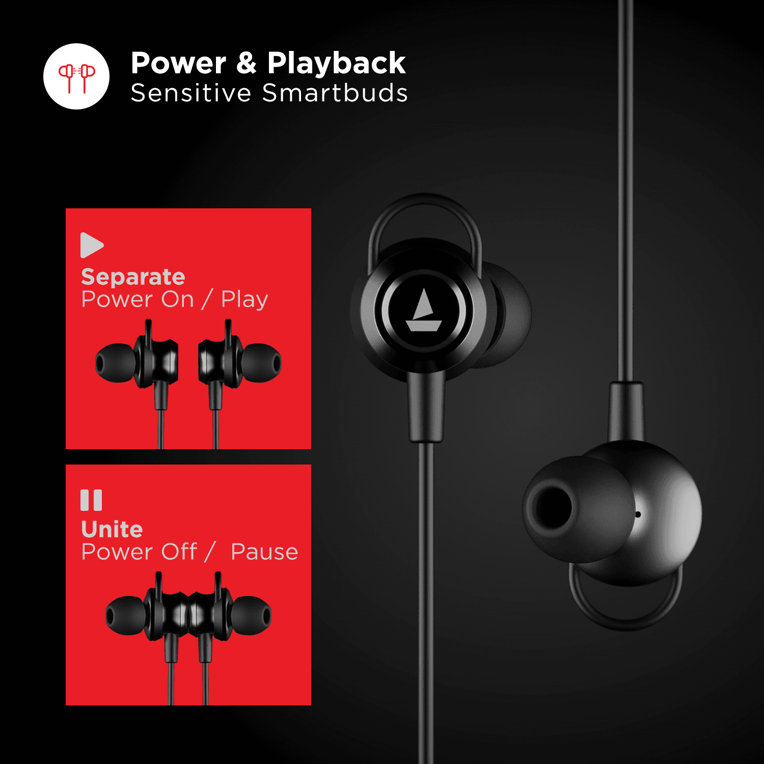 Rockerz 355 comes with power and playback sensitive magnetic Smartbuds®. Separate them to power on/play music and unite to power off/pause music.