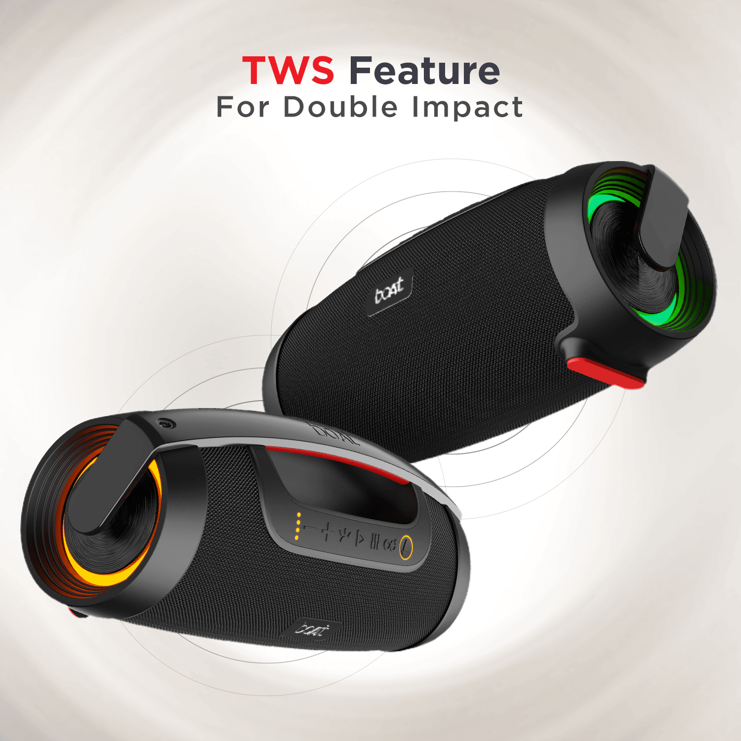 There’s a new boom in town – boAt Stone 1450 with 40W RMS boAt Signature Sound. Just the perfect partner for you to dance outdoors with its Outdoor EQ mode and a carry handle for enhanced portability. Or you can groove to your tunes indoors with the Indoor EQ mode and double up the vibe of your house parties by pairing two Stone 1450s together with TWS technology. Make this Stone your music partner that brings the vibe come alive with its dynamic RGB LEDs and let the grooving never stop.